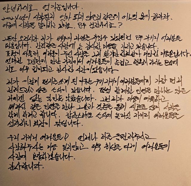 이날 엄기준은 자신의 채널을 통해 팬들에게 결혼소감을 손편지로 직접 전했다.