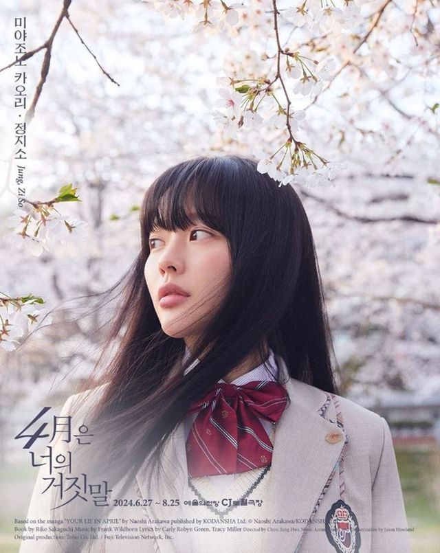EMK뮤지컬컴퍼니는 최근 공식 SNS 채널을 통해 뮤지컬 ‘4월은 너의 거짓말’ 캐릭터 포스터를 오픈, 미야조노 카오리 역에 캐스팅된 정지소의 비주얼로 팬들의 이목을 사로잡았다.