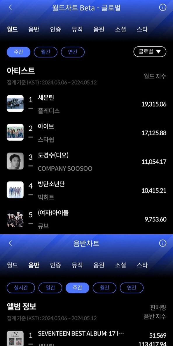 세븐틴은 음반 부문에서 높은 점수를 획득하며 1만9315.06점의 월드 지수를 기록하며 1위에 올랐다. 이어 아이브가 월드 지수 1만7125.88점으로 2위, 도경수(디오)가 월드 지수 1만1054.17점으로 3위를 차지했다.