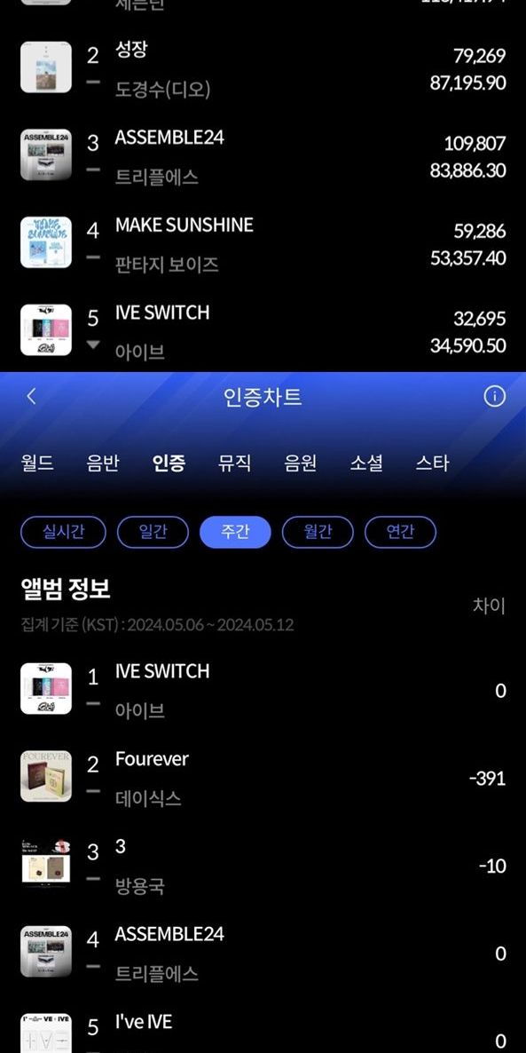 또, 주간 인증차트에서는 아이브에 이어 데이식스의 미니 8집 'Fourever'가 2위, 방용국의 EP 3집 '3'이 3위를 기록했다.