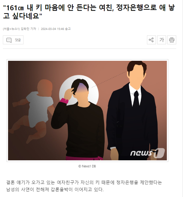 하지만 A 씨는 여자친구에게 키가 작은 아이로는 키우고 싶지 않다고 말했다. A 씨의 신장은 161㎝였다.