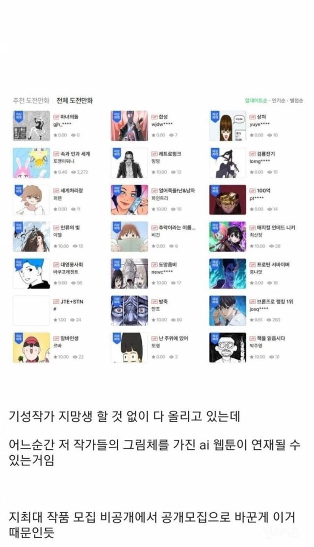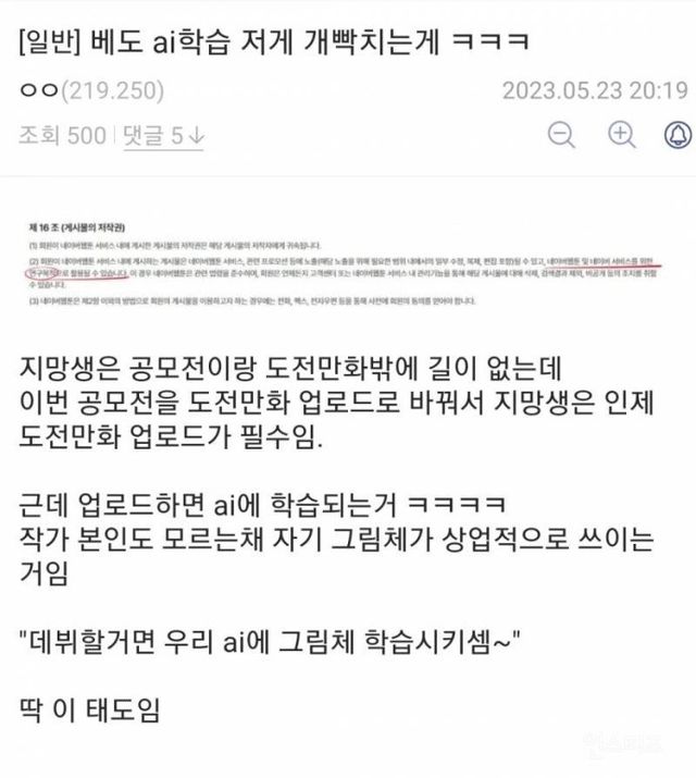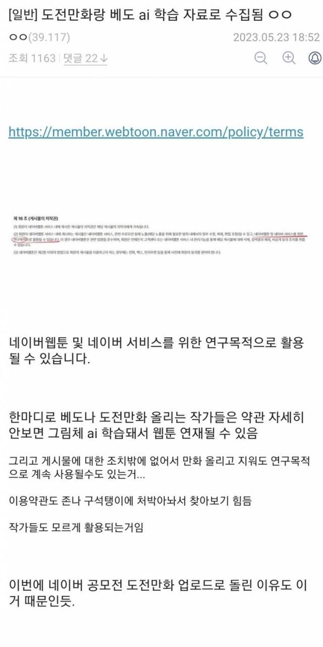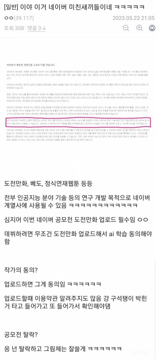 공모전에 올라온 모든 작품 그림체를 네이버가 개발중인 AI에 학습시키고 이용하겠다 일방적으로 통보