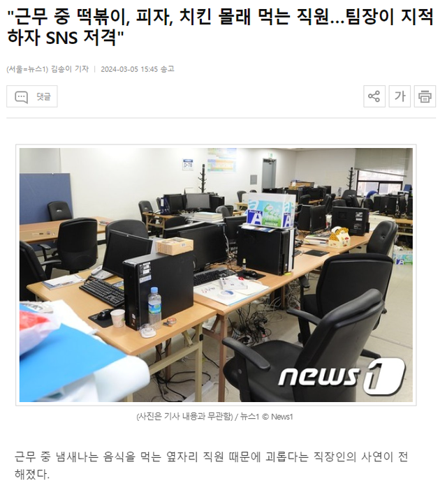 A 씨는 "자꾸 떡볶이, 피자, 치킨(심지어 뼈 치킨) 등을 락앤락에 담아와서 먹으면서 일한다. 팀장님이 냄새난다고 식사는 먹고 오든지 점심시간에 먹든지 근무 중엔 자제하라고 했더니 인스타에서 팀장님을 저격하더라"며 기가 막혀했다.