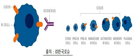 ‘오크레부스주(오크렐리주맙)’는 선택적으로 CD20(pre-B세포, 성숙 및 기억 B세포에서 발현되나 림프구 줄기세포 및 형질세포에서는 발현되지 않는 세포 표면 항원)을 발현하는 B세포를 표적으로 하는 재조합 인간화 단클론항체(mAb, IgG1)로 B세포의 수를 줄이고 기능을 감소시켜 다발성 경화증을 억제한다.