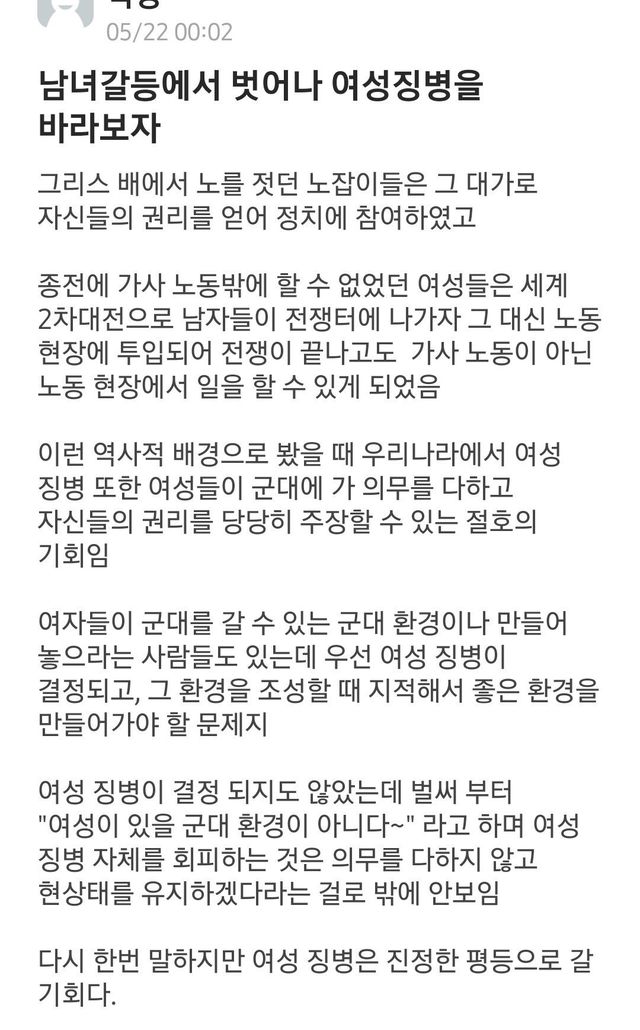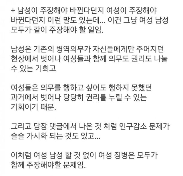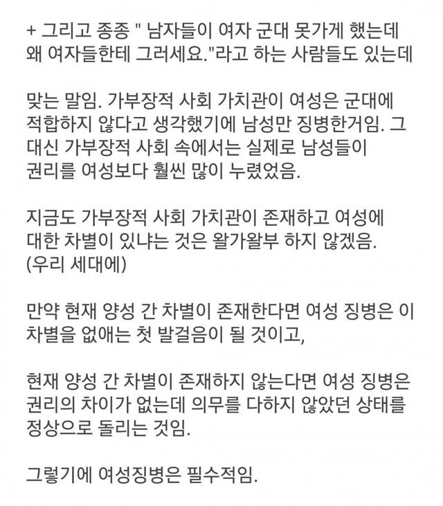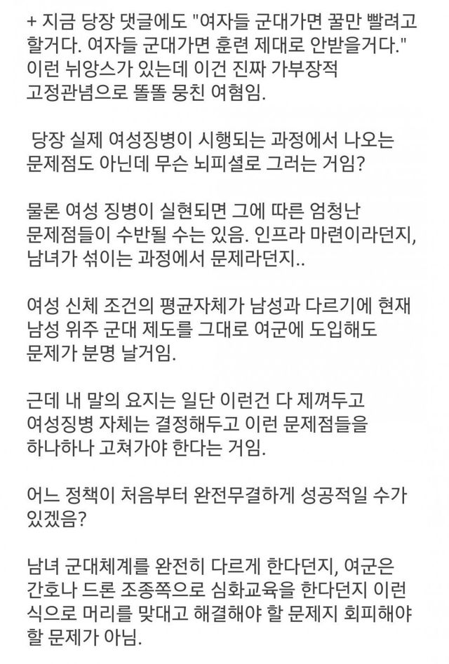 1. 여성 징병 후 문제점이 많을거라고 해도 우선 결정해놓고 해결해야할 문제지 회피해야할 문제가 아니다.