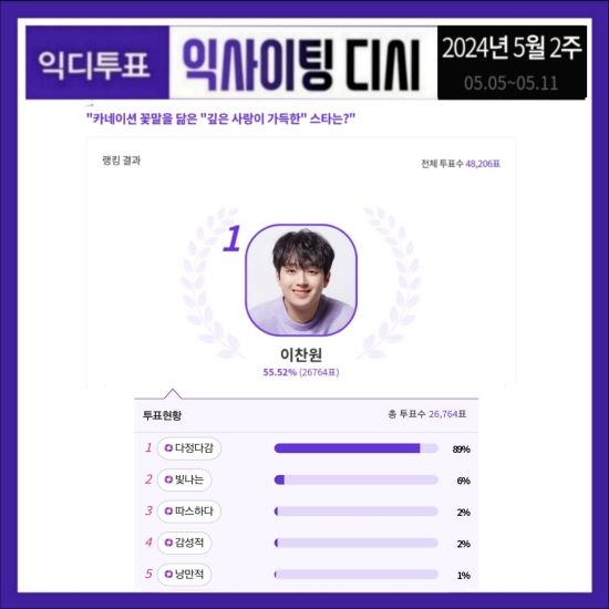 익사이팅디시는 5월 5일부터 11일까지 진행된 '카네이션 꽃말(사랑에 대한 믿음, 건강을 비는 사랑)을 닮은 깊은 사랑이 가득한 스타' 투표에서 이찬원이 1위를 차지했다고 발표했다.