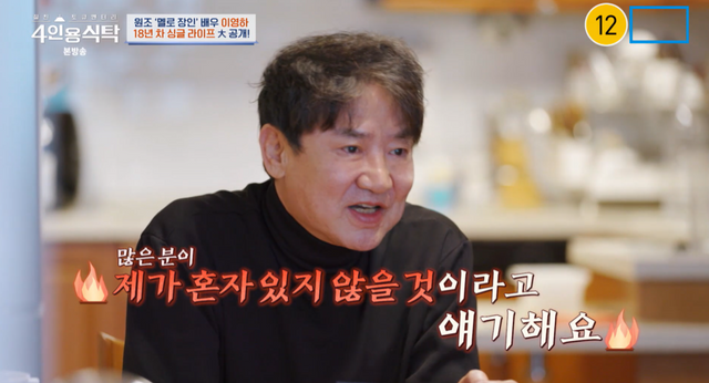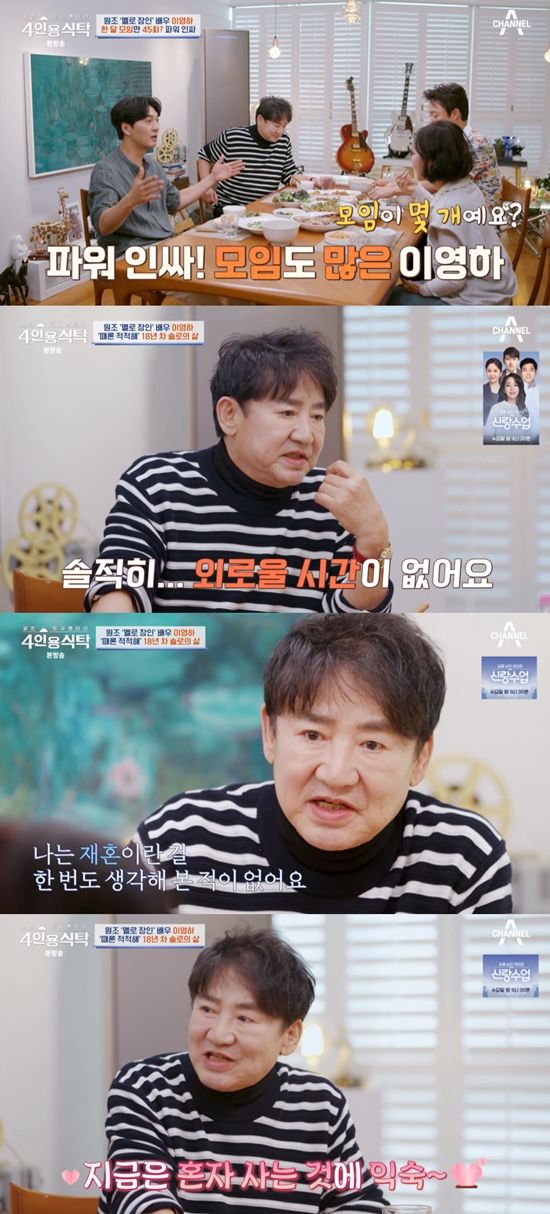 이에 노현희는 "끝까지 혼자 사실 건지 궁금하다"고 조심스레 물었고, 이영하는 "나는 재혼이란 걸 한 번도 생각해 본 적이 없다"면서 "지금은 혼자 사는 것에 익숙하다. 혼자 사는 삶이 편하고 때론 적적할 때도 있지만 그래서 잘 때 TV를 켜고 잔다. 사람 소리가 난다는 게 나한테 안정감을 준다"고 말했다.