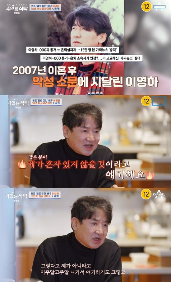 이영하는 지난 2007년 선우은숙과 이혼 후, 지금까지 악성 소문에 시달리고 있음을 토로해 눈길을 끌었다. 그는 "많은 분들이 제가 혼자 있지 않을 것이라고 얘기한다. 아니라고, 여자라고 하면 경계한다고 해도 믿어주질 않는다. 제가 아니라고 미주알고주알 나가서 얘기하기도 그렇고"라고 솔직하게 이야기했다.