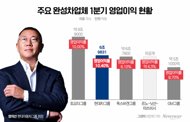 현대차그룹의 올해 1분기 영업이익률은 10.40%로, 토요타그룹(10.0%)을 제치고 업계 1위에 올랐다. 폭스바겐그룹(6.10%), 르노-닛산-미쓰비시 얼라이언스(4,3%), GM그룹(8.70%) 등 글로벌 완성차업체 대부분은 영업이익률 10%의 벽을 넘지 못했다. 자동차 등 제조업은 원가 비중이 높아 통상 10% 이상의 영업이익률을 달성하기 어려운 것으로 알려져 있다.