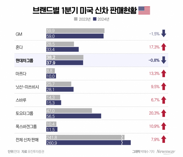 유진투자증권에 따르면 현대차‧기아의 올해 1분기 미국 판매량은 37만9293대로, 전년 동기 대비 0.80% 감소했다. 같은 기간 혼다(17.30%), 마쯔다(13.30%), 스바루(6.70%), 토요타(20.3%) 등 일본 브랜드들이 두 자릿수 성장세를 기록한 것과 대조적이다. 특히 올해 1분기 미국의 전체 신차 시장은 전년 동기 대비 7.9% 증가한 260만8715대로 집계됐다.