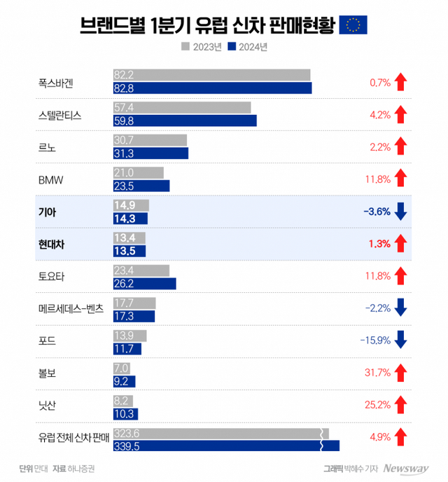 유럽 시장의 상황도 비슷하다. 하나증권에 따르면 올해 1분기 기아의 유럽 판매량은 전년 동기대비 3.60% 떨어진 14만3151대에 그쳤다. 같은기간 현대차도 1.30% 증가한 13만5281대를 기록하며 성장세가 한 풀 꺾였다. 반면 토요타는 전년 동기 대비 11.80% 늘어난 26만1707대를 팔았고, 닛산(10만3259대)도 유럽 판매량을 25.2%나 늘렸다.