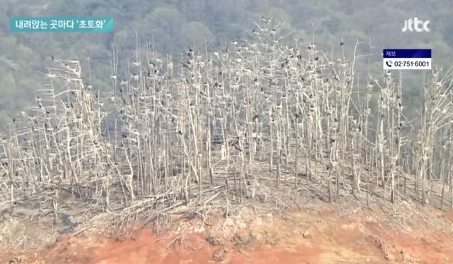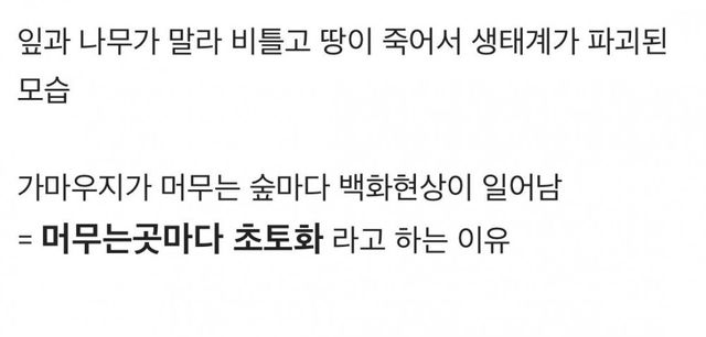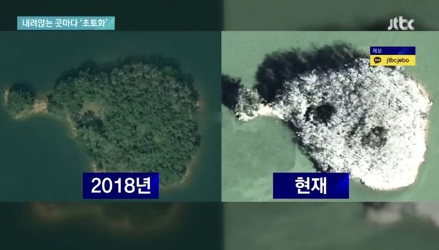 백화현상으로 위에서 보면 숲이 새똥때문에 하얗게 보임