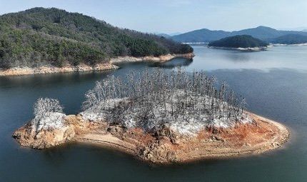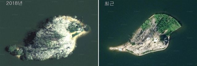 가마우지 배설물로 뒤덮여 하얗게 변한 모습