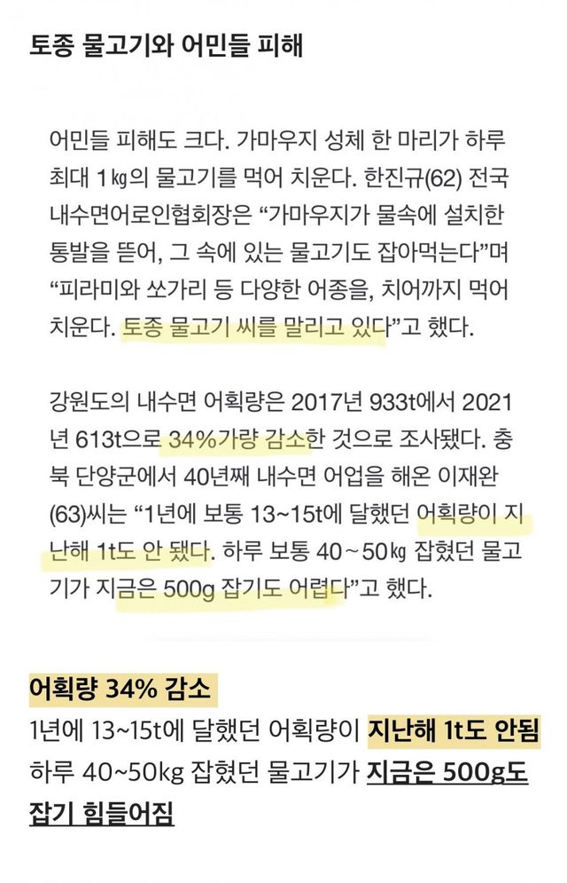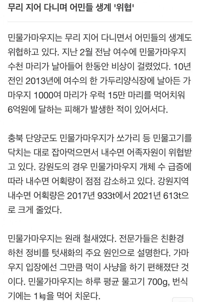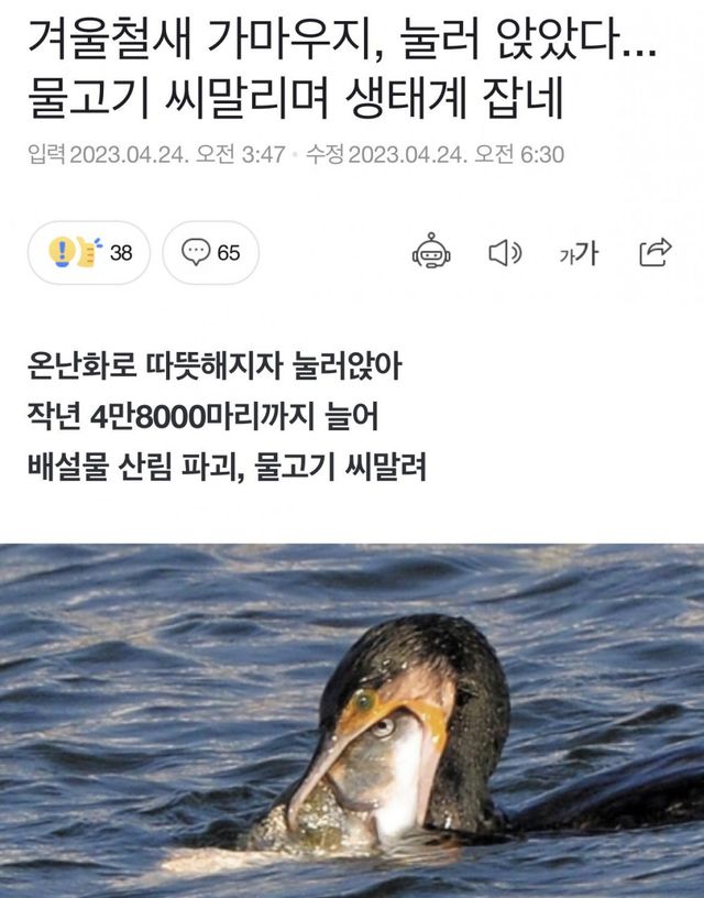 민물가마우지는 사냥도 잘하고 안먹고 죽이는 경우도 많아서 물고기 어획량이 확 줄음
