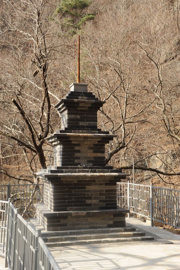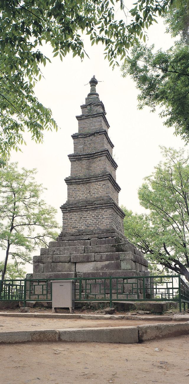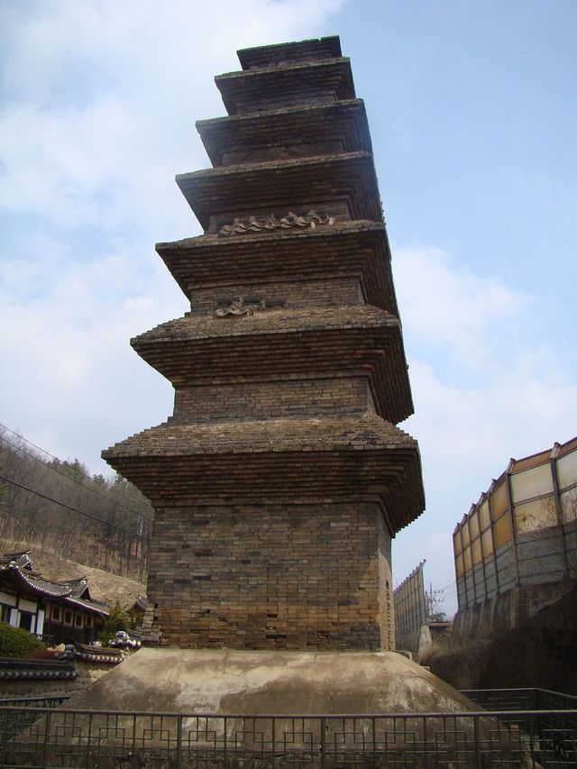 이후 1960년대에 완전히 붕괴되어있던 전탑을 이렇게 복구하였다. 앞서 본 사진하고는 전혀 딴판인 모습. 이것이 바로 전탑의 특수성인 원형과 전혀 다른 모습으로 수리될 수 있다의 좋은 예시가 될것이다.