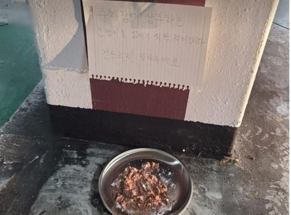 그가 함께 올린 사진 속에는 아파트 지하 주차장 한쪽에 놓아둔 먹이와 '주차장에 상주하는 고양이를 없애기 위한 먹이입니다. 건드리지 말아 주세요'라는 안내문이 담겨있었다.
