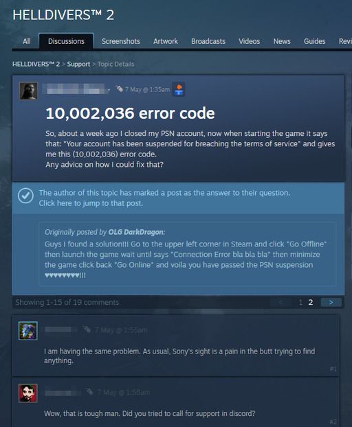 문제는 개발사도 이러한 문제를 인지하고도 별다른 조치를 하지 않고 있다는 점이다. 헬다이버즈2 스팀 커뮤니티나 공식 디스코드 채널 등에는 계정 해제 후 에러코드와 함께 실행이 되지 않는다는 사례글이 다수 게시됐지만, 운영진은 별다른 답변을 하지 않고 있다.