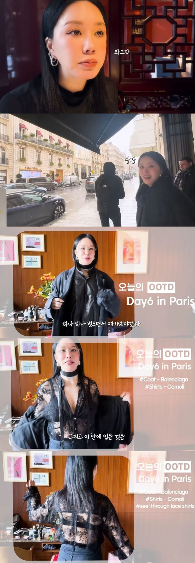 가장 먼저 코트를 벗은 엄정화는 "파리에 와서 내 몸에 붙은 발렌시아가 코트다. 남자 코트인데 톡톡한 티셔츠 느낌이라 엄청 편하고 니트를 입은 느낌이다"라고 만족감을 드러냈다.