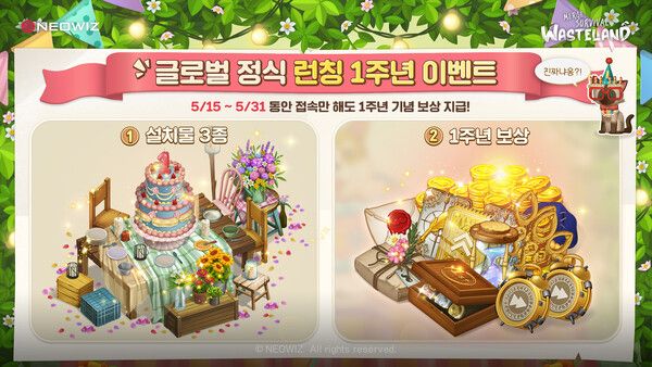 또한, 오는 15일 오전 11시 머지 서바이벌 공식 유튜브 채널에서 스티키핸즈 김민우 대표가 직접 유저 의견에 답하는 ‘1주년 기념 특별 Q&A 인터뷰’ 영상을 공개한다. 유저들의 궁금증에 답변하고, 머지 서바이벌의 세계관과 흥미로운 내러티브 등을 설명한다는 계획이다. 아울러 1주년 업데이트 안내, 개발 과정, 올해 하반기 서비스 방향성 등을 공유할 예정이다.신규 업데이트를 통해서는 신규 캐릭터 ‘유나’와 ‘이사벨라’가 등장하는 흥미로운 스토리를 담은 24 챕터가 공개됐다. 여기에 길고양이 패스 5월 고양이 스킨 ‘파티의 주인공 길고양이’와 고양이 집 스킨 ‘축하의 1주년 기념 케이크’도 만나볼 수 있다.