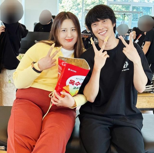 사진 속 수현은 큰 과자 봉지를 손에 든 채 같이 출연 중인 배우 장기용과 다정하게 포즈를 취하고 있다. 두 사람은 과자를 손가락에 끼우는 장난스러운 모습으로 웃음을 자아낸다.