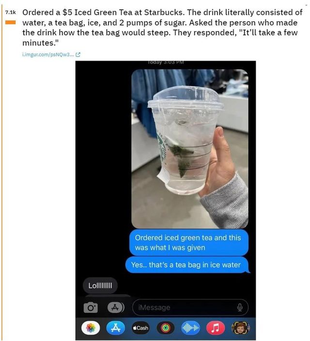 스타벅스에서 5달러 짜리 아이스 녹차를 시켰는데 받은 음료가 물, 티백 한 개, 얼음, 설탕 추가 2번으로 구성되어 있었음.