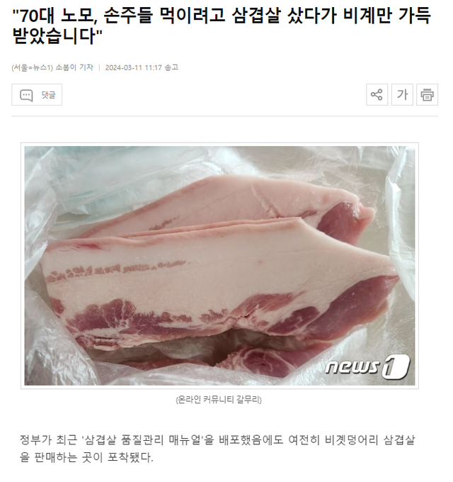 A 씨는 "딸이 손주들 데리고 온다는 이야기에 70대 노모가 손주들이 좋아하는 삼겹살을 사두셨다. 삼겹살 굽는데 이건 뭐…"라며 사진을 공개했다.