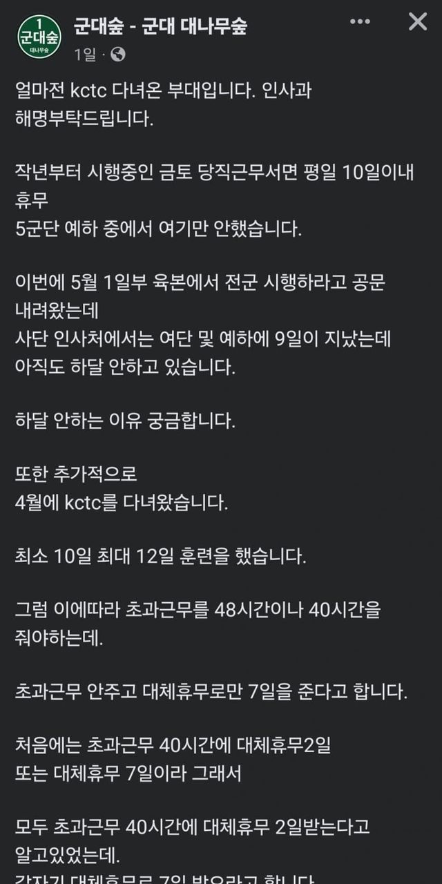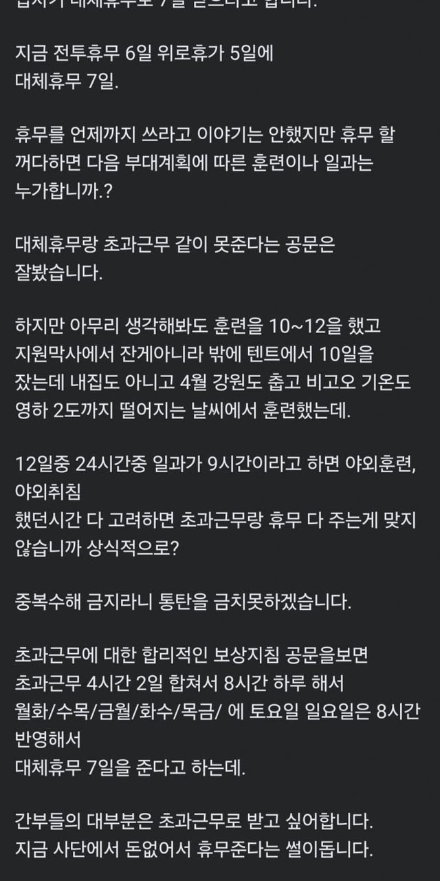 훈련수당 따로 있고, 초과도 일과 후 훈련이 이어지면 받아야 하며, 대체휴무도 초과 인정시간 이후까지 훈련이 이어진다면