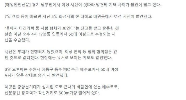 3/5 화성시 모 대학교 연못에서 50대 여성 시신 발견