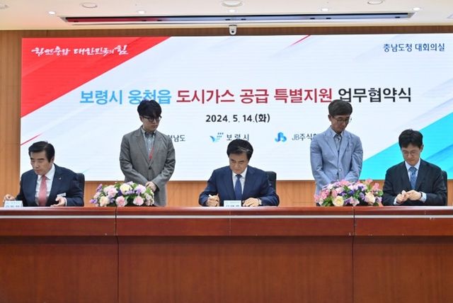 김태흠 지사는 14일 도청 대회의실에서 김동일 보령시장, 김영석 제이비 대표와 ‘보령 웅천읍 도시가스 공급 특별지원을 위한 협약’을 체결했다.
