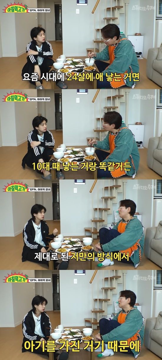 장성규는 "24살에 아이를 낳지 않았냐. 요즘 시대에 24살에 아이를 낳는거면 예전에 10대 때 아이를 낳은 것과 마찬가지이지 않냐. 어땠냐"고 얘기했다.