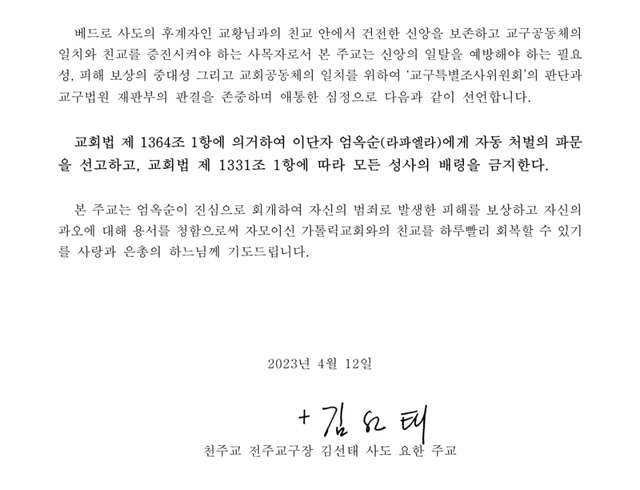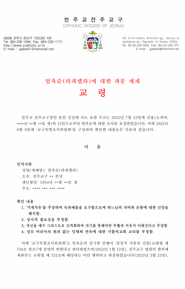 2023년 4월 초, 천주교 전주교구의 엄옥순(라파엘라)이라는 신도가 교회에 물의를 일으킨 관계로 주교가 엄옥순을 파문했으니 조심하라는 소식을 다른 교구에 전달했다고 한다.