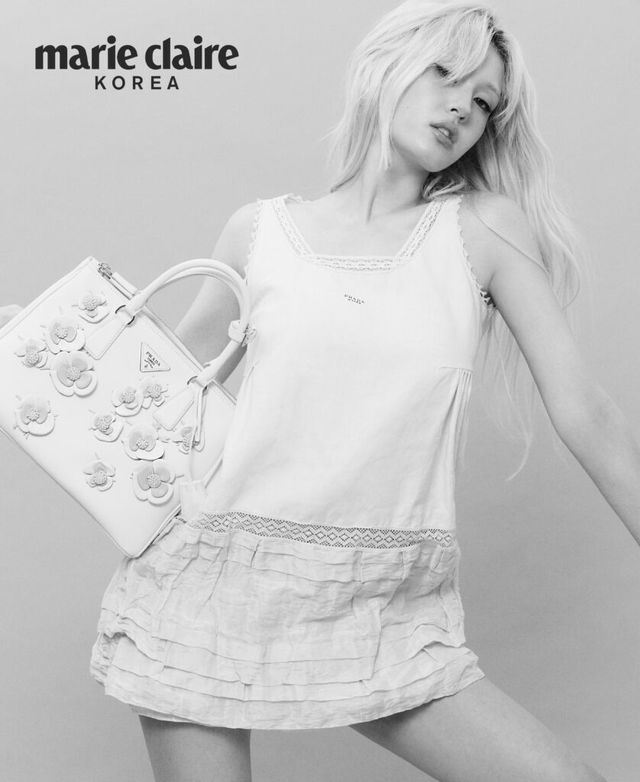 코튼 미니드레스, 화이트 플로럴 아플리케 장식 라지 프라다 갤러리아 가죽 백 모두