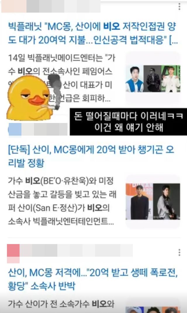 15일 비오는 자신의 채널에 정산 관련 기사를 캡처해 올리며 "돈 떨어질 때마다 이러네 이건 왜 얘기 안해"라는 글을 작성했다.