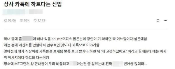 A씨는 “얼마 전에 이 사원이 직장이랑 카톡 한 걸 보게 됐다. 보통 보고 받거나 하면 네 고생하셨다 이러고 끝내지 않느냐”며 “이 사원은 마지막 메시지에 하트를 단다”고 했습니다.