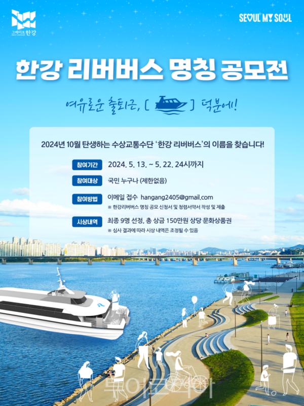 [투어코리아=유경훈 기자] 서울시가 오는 10월 한강에 선보이는 수상 교통수단 ‘한강 리버버스’의 새로운 이름 공모를 22일까지 실시한다.