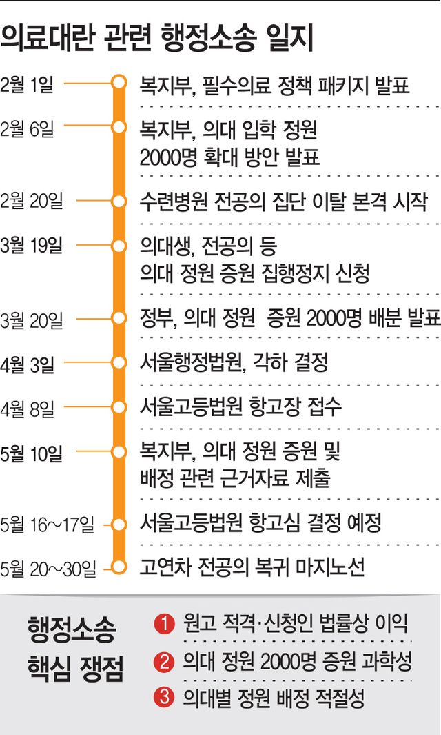 이에 고법이 어떤 결정을 내릴 지 시선이 집중된다. 법원이 각하 또는 기각하면 정부의 증원 정책이 힘을 받지만, 인용할 경우 입시 일정을 감안할 때 2025학년도 2000명 증원은 무산될 수 있다.