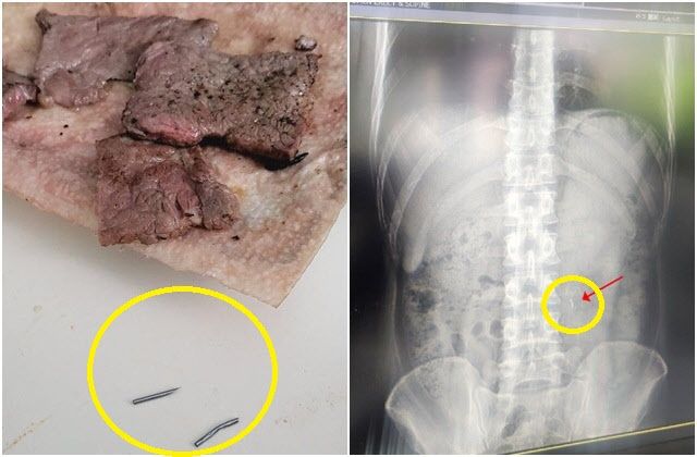 부부는 바로 식사를 중단한 뒤, 남은 고기를 가위로 다 잘라 확인했지만 다른 조각은 나오지 않았다고 했다. 하지만 이미 400g 정도 먹은 상태라 혹시 다른 조각을 삼킨 건 아닐까 싶어 응급실을 찾아 엑스레이를 촬영했다.