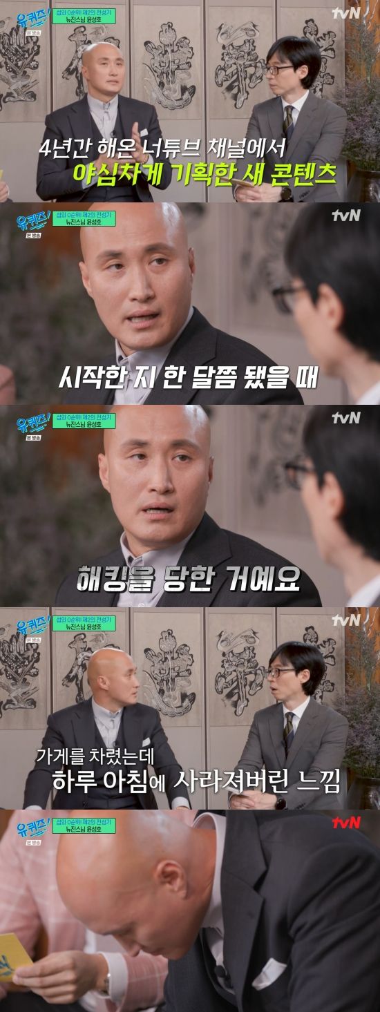 윤성호는 "처음부터 분위기가 좋았다. 세호도 나와주고. 중간에 메일로 광고도 들어오고. '이거 괜찮겠다' 했는데 한 달인가 한 달 반 만에 갑자기 새벽에 눈 뜨자마자 봤는데 제 채널에 제 얼굴이 있어야 되는데 다른 사람 얼굴이 있는 거다. 해킹을 당한 거다. 갑자기 채널이 없어졌다. 그냥 가게를 하나 차렸는데 오픈하러 갔는데 빈 땅이 돼 있는 느낌이었다. 준비를 너무 많이 했는데. 그때 잡았던 멘탈이 무너지더라"라며 고백했고, 끝내 눈물 흘렸다.