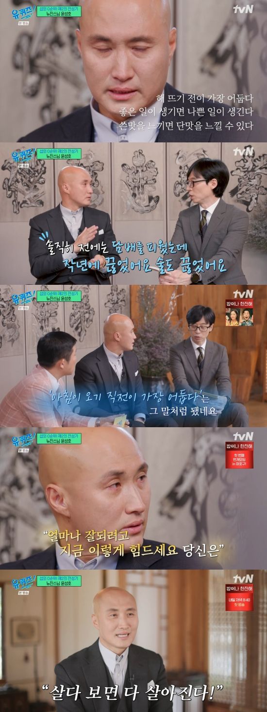 윤성호는 "책상 밑에 들어가 있는 게 너무 편했다. '해 뜨기 전이 가장 어둡다. 새옹지마. 좋은 일이 생기면 나쁜 일이 생긴다. 쓴맛을 느끼면 단 맛을 느낄 수 있다' 이런 걸 계속 생각했다. 내가 얼마나 잘 되려고 이렇게 힘든 거야. 정신을 부여잡고 운동에 쏟아붓고 그때 전에는 담배를 피웠는데 작년에 끊었다. 술도 끊었다. 힘들 때일수록 하면 안 될 거 같더라. 돌아왔더니 (뉴진스님으로 화제를 얻는) 이런 일이 생기더라. 제가 경험을 했으니까 진짜 힘든 사람한테는 꼭 이런 이야기해 주고 싶다. '얼마나 잘 되려고 지금 이렇게 힘드시냐. 당신은' 이런 이야기해 주고 싶다"라며 전했다.