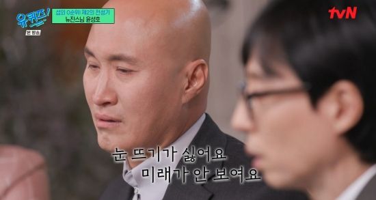 이날 윤성호는 부 캐릭터 뉴진스님으로 등장해 높은 화제성을 자랑했다. 유재석은 "해가 뜨기 직전이 가장 어둡다고 하지 않냐. 우리 성호 씨에게도 작년이 많이 힘든 한 해였다고 하더라"라며 물었다.