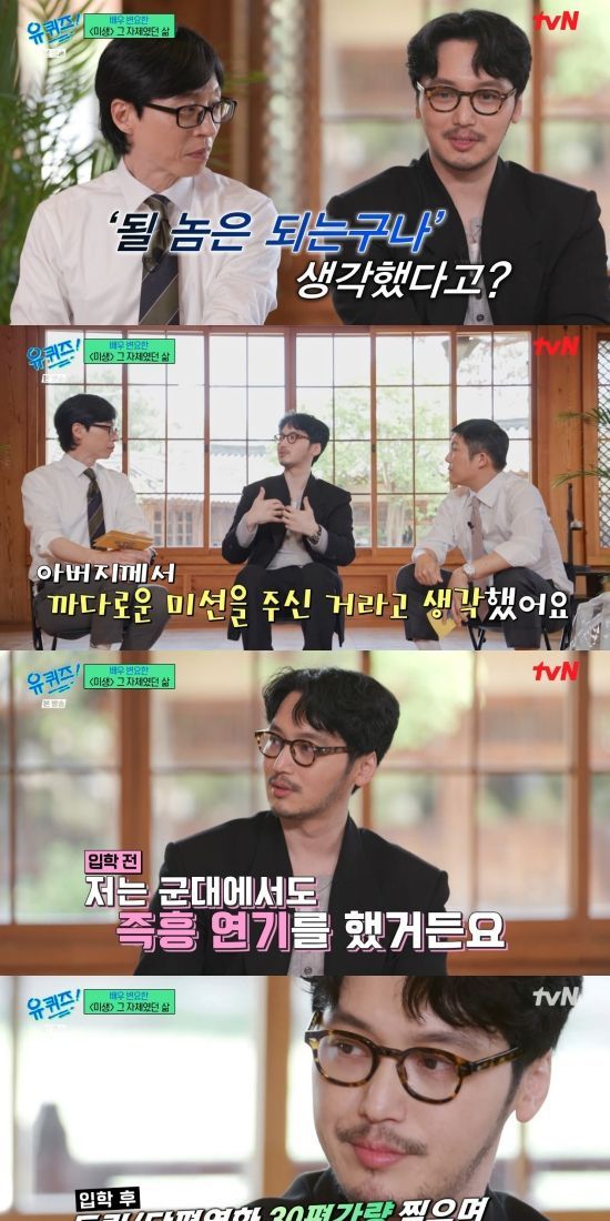 유재석은 "한예종에 합격하고 솔직히 변요한 씨는 '될 놈은 되는구나' 생각하셨다고"라며 질문했고, 변요한은 "그때 당시에는 들어가기 까다로운 미션을 준 거라고 생각했다. 아버지가. 떨어질 거라고 생각하셨던 거 같다. 저는 군대에서도 즉흥 연기를 했다. 후임들이랑 근무 나가면 '너 휴가 때 어땠어. 그때 뷰가 어땠어. 여자친구와 관계가 어땠어. 어떤 일이 있었어?' 계속 연기를 했다. 그게 저한테는 훈련법이었다. 소각장 이런 데 가서 연기를 하고"라며 과거를 회상했다.
