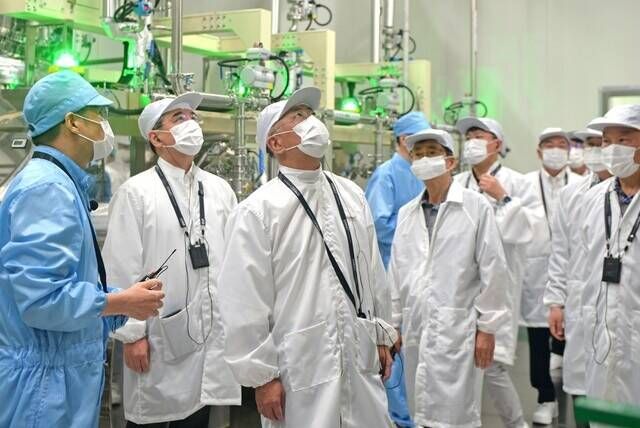 정의선 현대차그룹 회장이 지난해 9월 LG에너지솔루션 인도네시아 배터리셀 합작공장 HLI그린파워를 방문해 전극공정을 점검하고 있다. /현대차그룹