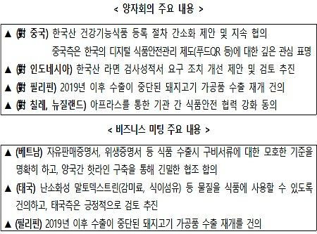 식약처는 우리나라 주요 식품 수출국인 중국, 인도네시아, 뉴질랜드 등과의 양자회의에서 국내 제품 수출 시 규제장벽을 해소하기 위해 건강기능식품 등록 간소화, 라면 검사성적서 제출 의무 폐지 등 다양한 건의사항을 논의하고 규제당국 간 상호 협력도 강화하기로 했다.