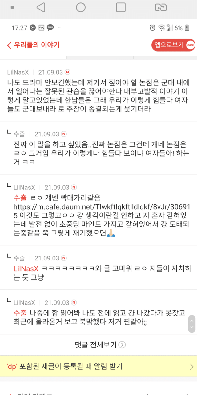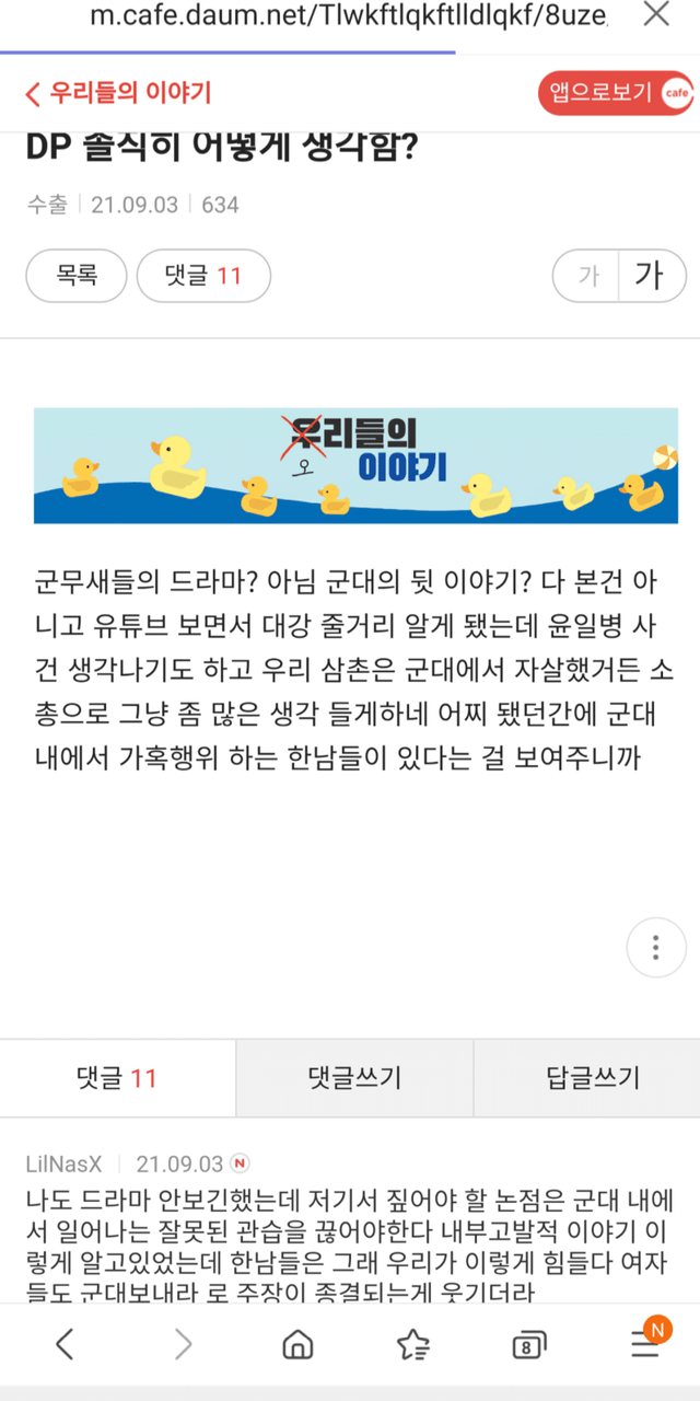 꿀잼 말머리) DP 를 본 여초 카페 유저의 반응