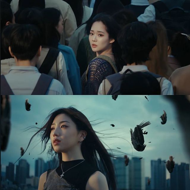 수많은 사람들 속에서 불안한 표정으로 서있는 멤버, 하늘에서는 까마귀가 뒤집힌 채 떨어지고 멤버 2명이 옥상에서 떨어지는 듯한 카메라 앵글까지 다소 자극적일 수도 있지만, 트리플에스는 “원래 청춘이라는 게 마냥 찬란한 건 아니니까”라는 메시지를 당당히 전달한다. 그리고 뮤직비디오 후반에는 멤버 유연의 “다시 시작해 볼까”라는 가사와 함께 어둠 속에서 조금씩 벗어나는 트리플에스 멤버들이 비친다.