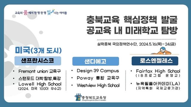 윤건영 교육감과 연수단은 ▲2024년 미국 100대 우수교인 로웰고등학교 방문 ▲스탠포드 대학 방문 및 AI 교육 특강 ▲포웨이통합교육구 방문 ▲디자인 39 캠퍼스 방문 ▲뉴욕필름아카데미와의 간담회 등을 진행하며 충북미래학교의 나아갈 방향을 모색한다.