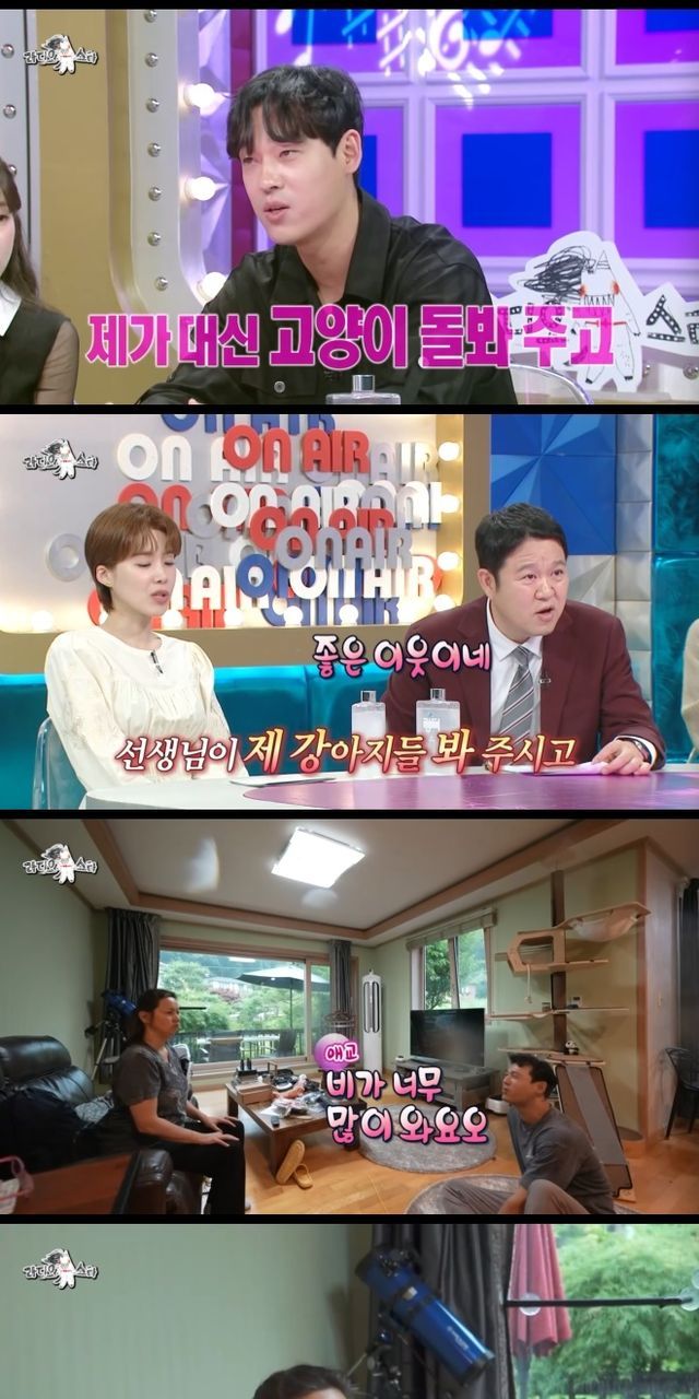 이어 "선생님 집에 많이 얹혔다. 밥도 얻어먹고 세탁기도 좋은 걸 갖고 있기 때문에 세탁기도 많이 쓰고 원체 바쁜 사람들이다. 선생님이 지방을 내려갈 때 있으면 내가 대신 고양이 세 마리 밥을 먹인다. 나는 강아지 두 마리를 키운다. 내가 바쁘면 선생님이 와서 봐준다"라고 전했다.