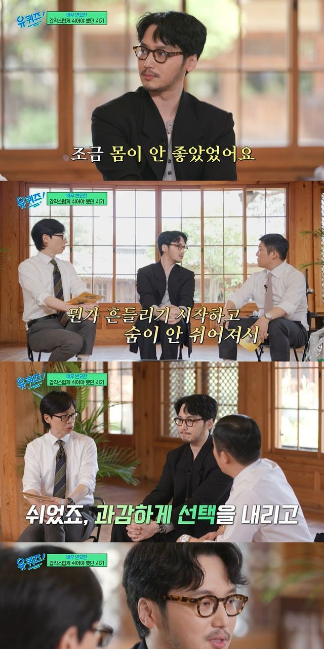 변요한은 "쌓인 것 같다. 독립 영화를 쉬지 않고 찍다가 더 큰 필드에 와서 압박을 느끼다 보니 조금 몸이 안 좋았다. 뭐가 흔들리기 시작하고 숨이 안 쉬어져서 '당분간 연기를 못 하겠다' 싶었다"며 건강에 이상이 왔었음을 고백했다.