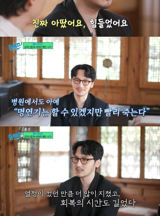 이에 변요한은 "당시에 진짜 아팠다. 너무 힘들었다. 내가 그렇게 좋아하던 연기를 막상 할 수 있겠다싶을 때 부러지니까 정말 끝까지 갔던 것 같다. 병원에서도 이 상태로 갔다가는 '명연기는 할 수 있겠지만 빨리 죽는다'고 말할 정도였다"며 당시 심각했던 상태를 설명했다.
