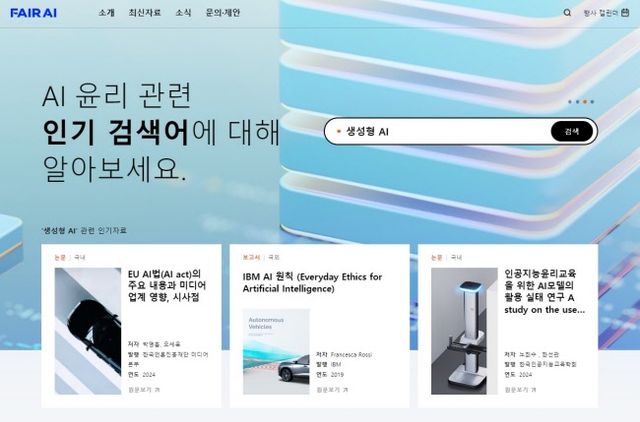 '페어 AI'는 국내외 논문 및 보고서, 언론 기사, 가이드라인, 커리큘럼 소개 등 AI 윤리와 관련된 다양한 정보를 통합 제공한다. 'FAIR'는 'Faithful', 'Accountable', 'Inclusive', 'Responsible'의 앞 글자를 딴 약자로, '공정하고 책임감 있는 AI 정보 라이브러리'라는 의미를 담고 있다.
